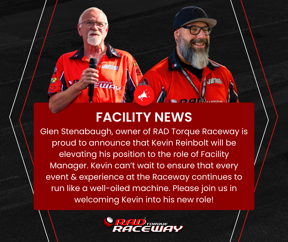 RAD Torque Raceway and owner Glen Stenabaugh are proud to announce that long-time team member and operational powerhouse, Kevin Reinbolt, will be elevating his position to Facility Manager!