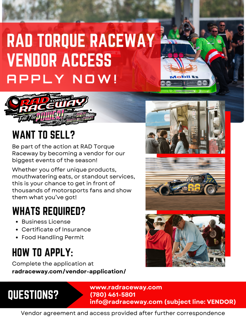 RAD Torque Raceway is now accepting vendor applications for our biggest events this season! From local makers to food truck favourites and specialty services—if you’ve got something awesome, we want to hear from you.